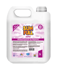 SUN FULL Aromatizador de Prendas. Agradable fragancia. Mejora notablemente la presentación de las prendas. Complemento ideal del suavizante. Soluciona el problema de la pérdida parcial del perfume del suavizante en el proceso de secado. Altamente estable. En condiciones normales no presenta pérdidas o variaciones en la fragancia. Alto rendimiento. Exclusivo uso profesional. Recomendaciones: Está especialmente recomendado para: Hospitales: ropa de cama, uniformes, ropa de cirugía. Hoteles: ropa de cama, toallas, uniformes, mantelería, ropa de cocina. Lavaderos Industriales: ropa de cama, uniformes, ropa de cirugía, toallas, mantelería, ropa de cocina. Descripción e Indicaciones: Producto especialmente formulado para resaltar la fragancia del suavizante en prendas procesadas. Producto líquido y traslúcido, con agradable y persistente fragancia. Formulado en base a una seleccionada mezcla de fragancias y estabilizantes en medio alcohólico.